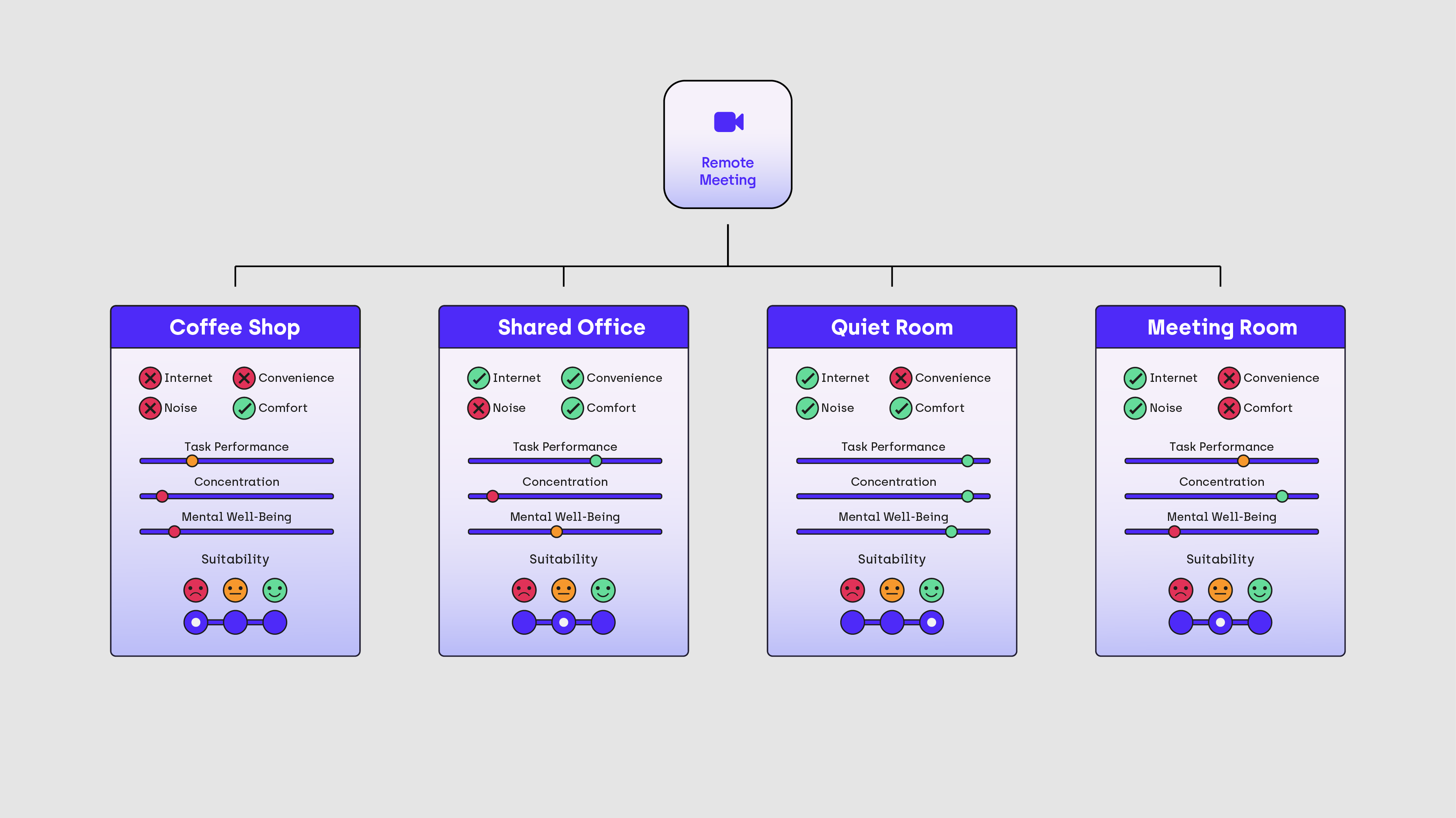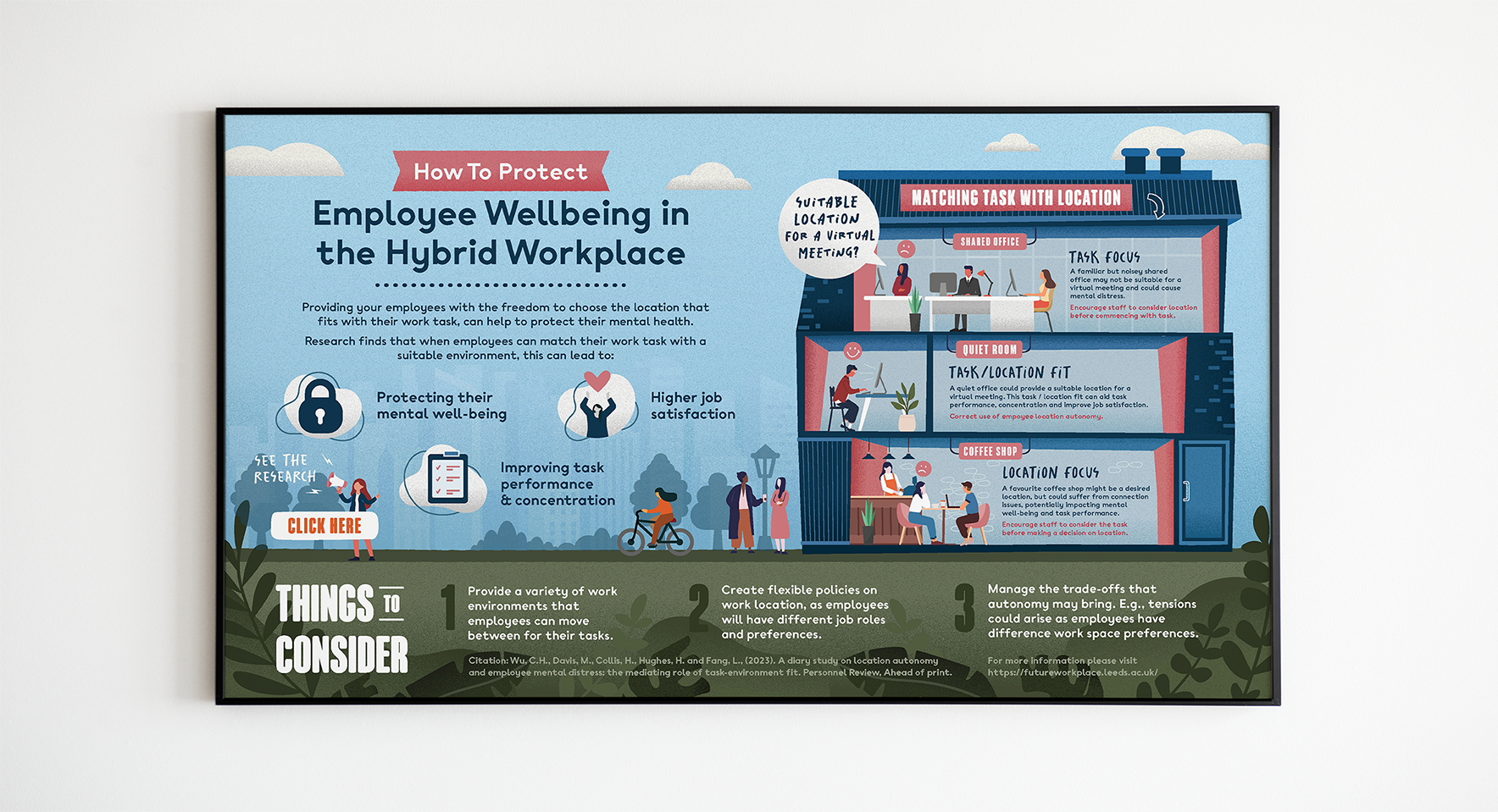 This project required us to produce an infographic, both for digital and physical spaces, along with an AR experience which explored employee well-being in the hybrid workplace. The key points from the research were that providing employees with the freedom to choose a location that best fits their work task, can protect their mental well-being. The infographic explores a workplace scenario, were a suitable location needs to be identified for a certain task, exploring the potential outcomes for the correct or incorrect use of location autonomy. The AR experience allowed us to take this a step further, by allowing for a variety of tasks to be selected, generating a different set of outcomes depending on the selected task. This allowed us to highlighting further the importance of not just allowing for location autonomy in the workplace, but its correct application.